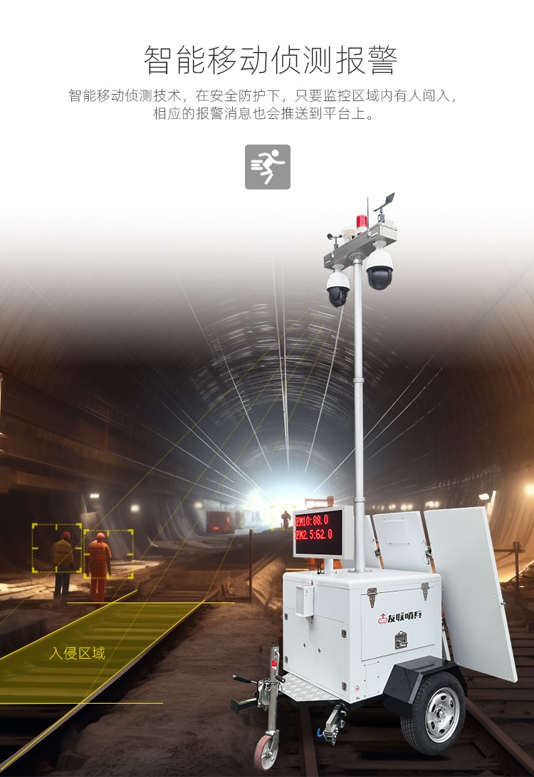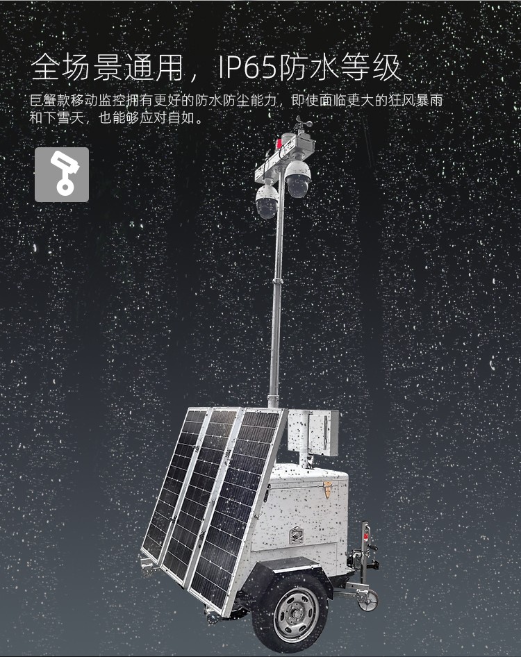友聯(lián)哨兵巨蟹款太陽能供電工地揚塵氣象監(jiān)測移動監(jiān)控車(系統(tǒng)),自帶網(wǎng)電,具備較高的機動性,系統(tǒng)可集高清視頻監(jiān)控、照明、報警、廣播、對講、氣象環(huán)境監(jiān)測(選配)、存儲、控制、無線傳輸、一鍵升降等功能于一體,并可具備市電、太陽能等多種能源補給方式,提升續(xù)航時間,以適應各類復雜的環(huán)境。戶外使用,不懼風雨。